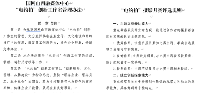 制定《“電約拍”創(chuàng)新工作室管理辦法》《2024年“師帶徒 青藍(lán)計(jì)劃”新聞采訪實(shí)訓(xùn)方案》《圖片資源管理系統(tǒng)管理辦法》《“電約拍”團(tuán)隊(duì)積分獎(jiǎng)勵(lì)辦法》《爭(zhēng)創(chuàng)“七個(gè)最”宣傳成果工作方案》《“為美好生活充電 為美麗中國賦能”攝影月賽評(píng)選規(guī)則》《“電約拍”采風(fēng)承諾書》等相關(guān)制度,通過完善的管理機(jī)制和制度,推進(jìn)了項(xiàng)目規(guī)范化運(yùn)營、標(biāo)準(zhǔn)化管理。加強(qiáng)團(tuán)隊(duì)文化建設(shè),“電約拍——佳片有約”團(tuán)隊(duì)師徒8人,通過附加“葫蘆家族”情愫,打造出“記錄時(shí)代、匠心傳承”的團(tuán)隊(duì)文化。